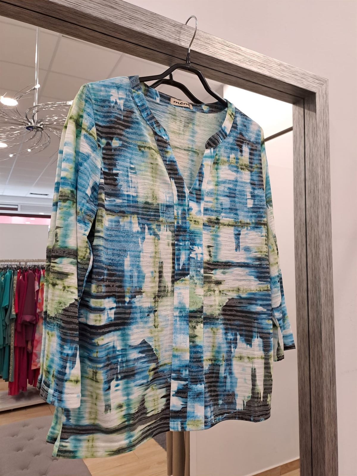 Camiseta en gamas de azules y verdes. mangas 3/4. Cuello escote a pico con tira tipo cuello mao.